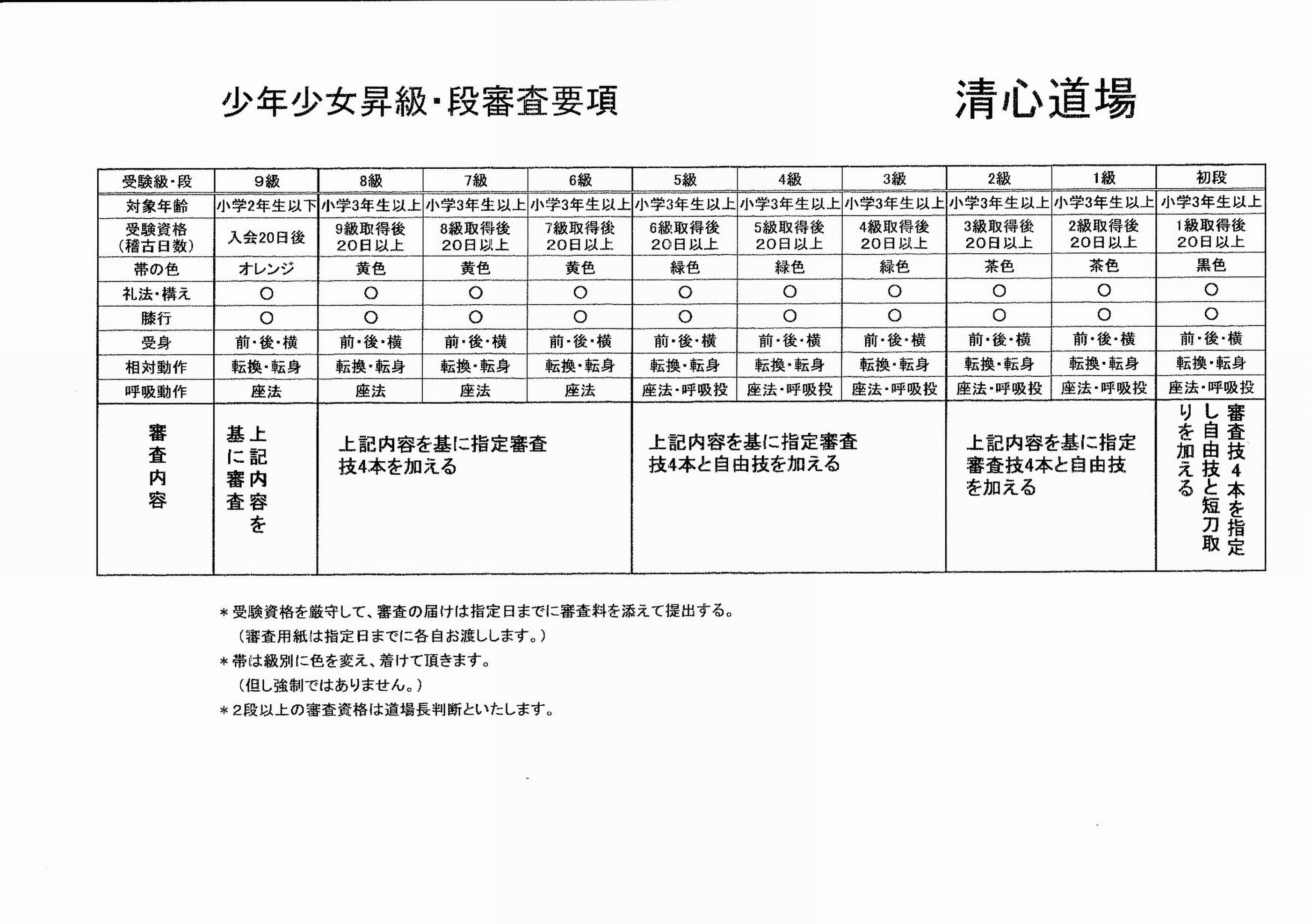 審査につきましては以下の要項に基づき実施します。8級に関しましては要項通り小学3年より受審可能ですが、入会から日が浅く技の習熟度が足りない場合は次回の審査にて受けて頂く場合があります。